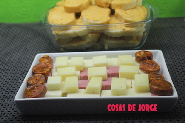 Normalmente suelo colocar lonchitas de embutido sobre pan untado con mi habitual salsa de tomate, pero en esta ocasión he preferido cortar los embutidos a daditos y dejar en otro plato las rebanadas de pan untadas con la salsa de tomate.
