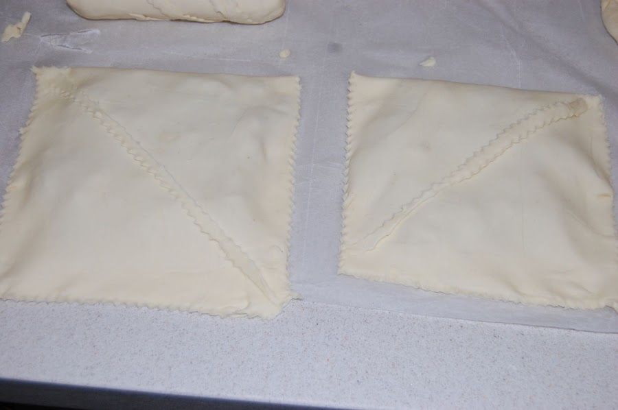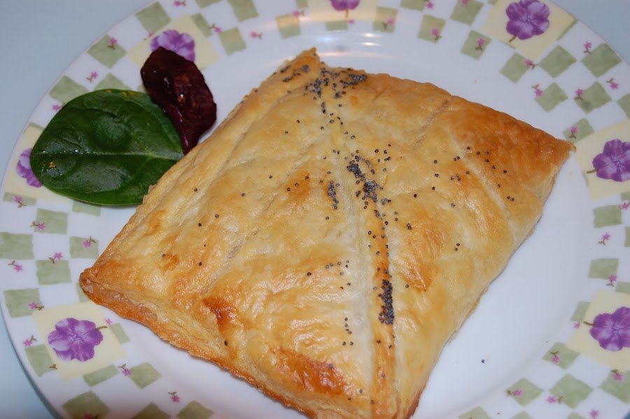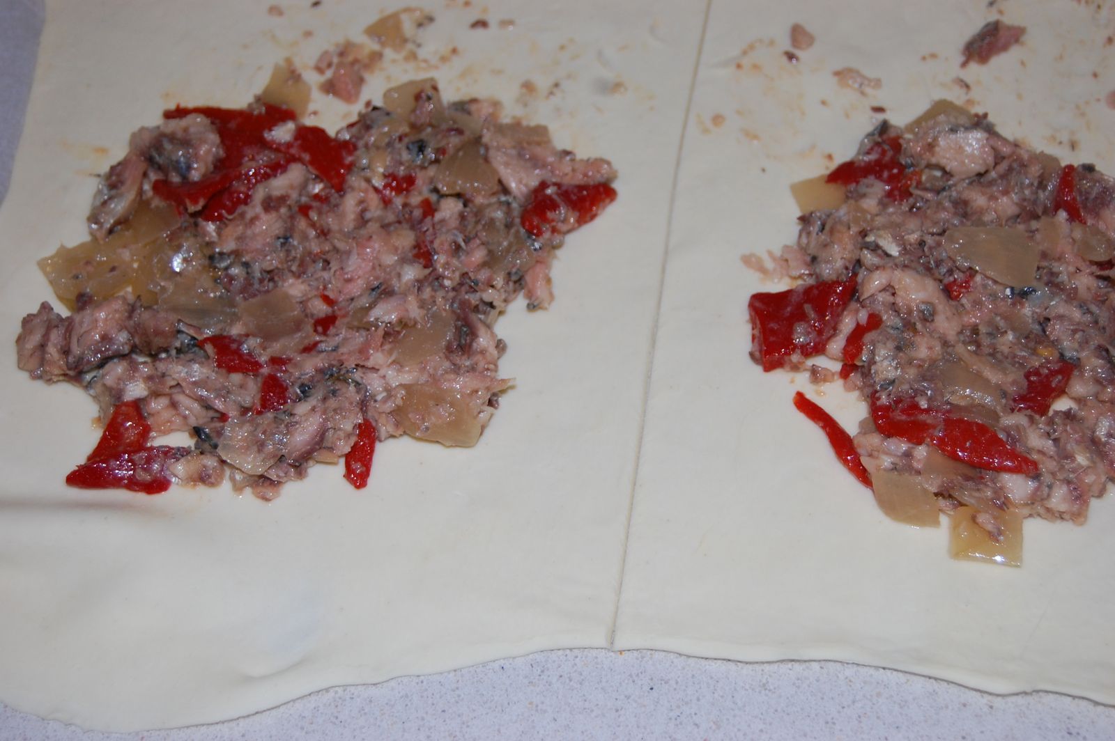 Desplegar la masa de hojaldre, cortarla en forma de cuadrado y este por la mitad, rellenar con la pasta en la parte inferior del rectangulo resultante y cerrar la empanada.