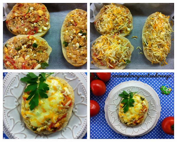 Os dejo una sencilla idea, por si os sobra masa para el relleno de la empanada, la guardais en la nevera y para una cena rápida a modo de pan pizza, colocamos el relleno sobre unos medios panecillos, en este caso son molletes de Antequera y espolvoreamos con queso rallado. Introducimos en el horno y lo gratinamos, Recordad que tanto el pan como los ingredientes están cocinados, así que el tiempo que el queso necesite para fundirse y gratinarse!! Prepararéis una cena express de lujo en unos minutos!!