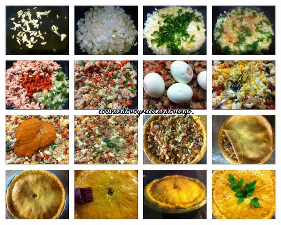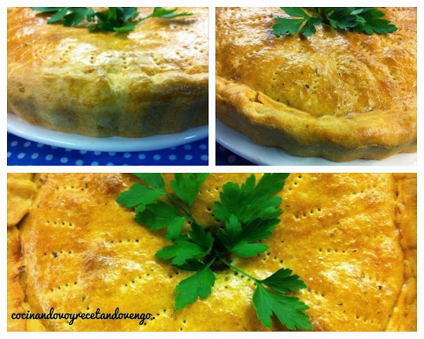 Cuando esté fría y la base de la masa colocada en el molde deseado, introducimos el relleno y lo cubrimos, sellamos los bordes (foto 11,12,13)