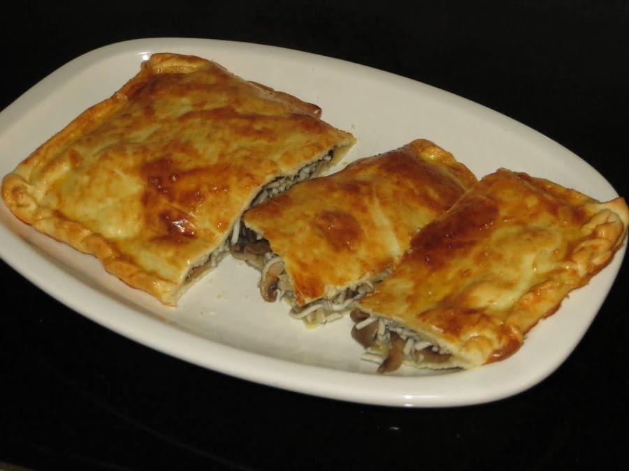 Estiramos nuestra masa de empanada y rellenamos la mitad con los champiñones y las angulas sucedáneas. Cerramos y pintamos con huevo batido. Metemos al horno a 180º durante 20 minutos o hasta que veamos que está dorada, sacamos y ya está lista para degustar.