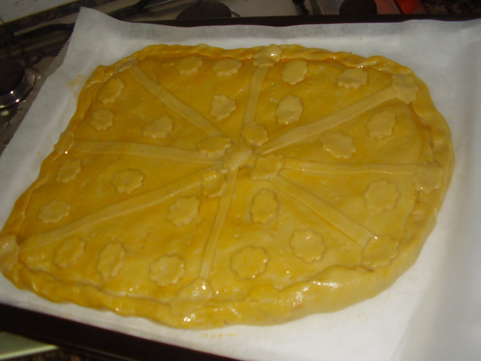 Templamos en un cazo el agua, el vino y el aceite. Una vez templado añadimos el azúcar y la levadura y la disolvemos bien con un tenedor, entonces pasamos a un cuenco más grande, y añadimos la harina y la sal, y mezclamos bien. Lo sacamos al mármol y la amasamos. Hacemos una bola y la ponemos en un cuenco, la tapamos con un trapo de algodón y la dejamos media hora que repose. Transcurrido este tiempo, dividimos la masa en dos bolas, una un poquito más grande que otra, cogemos la más pequeña, y con un rodillo la vamos aplanando hasta conseguir un círculo o cuadrado, según la forma que queramos. La pasamos a una bandeja de horno (donde habremos puesto un papel de aluminio y encima un papel de hornear), y ponemos el relleno de atún y verduras encima. De la bola más grande, separamos un trocito, para decorar. La aplanamos con el rodillo, y la pasamos encima del relleno. Cerramos alrededor con los dedos, o con un tenedor, y pintamos con la yema del huevo batida, para que quede bien pegado. Hacemos los adornos con el trocito de masa que habíamos separado, yo he puesto unas tiras y unas florecillas que he hecho con un cortapastas. Volvemos a pintar de nuevo con la yema para que quede bien pegado todo.