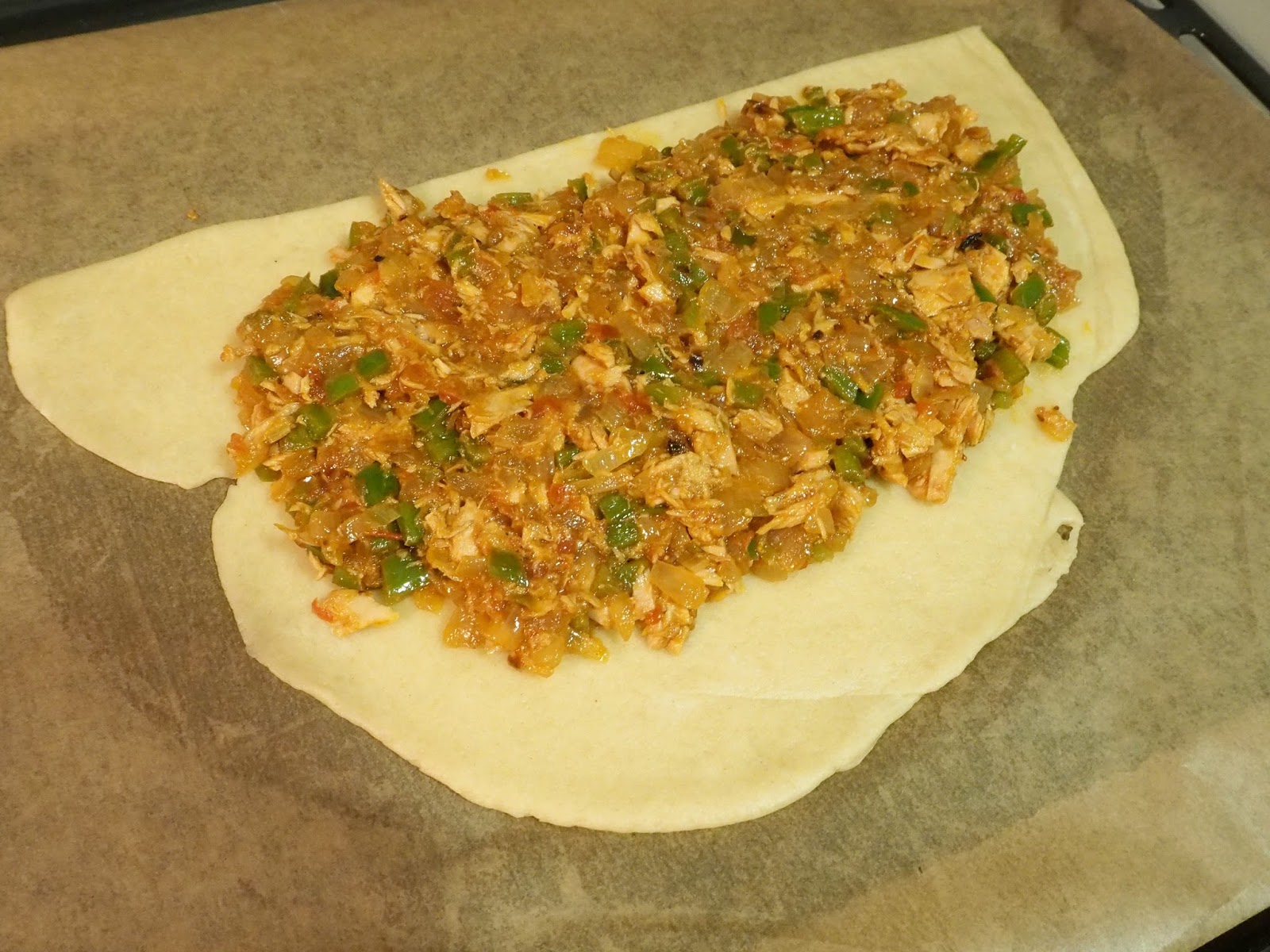 - Pasado el tiempo de reposo, estiramos la masa con un rodillo, la dividimos en dos trozos y sobre uno de ellos colocamos el relleno. A mi me gusta poner bastante (y claro, a veces se me acaba rompiendo la masa. Por suerte esta vez tuve mucho cuidado y salió todo bien).