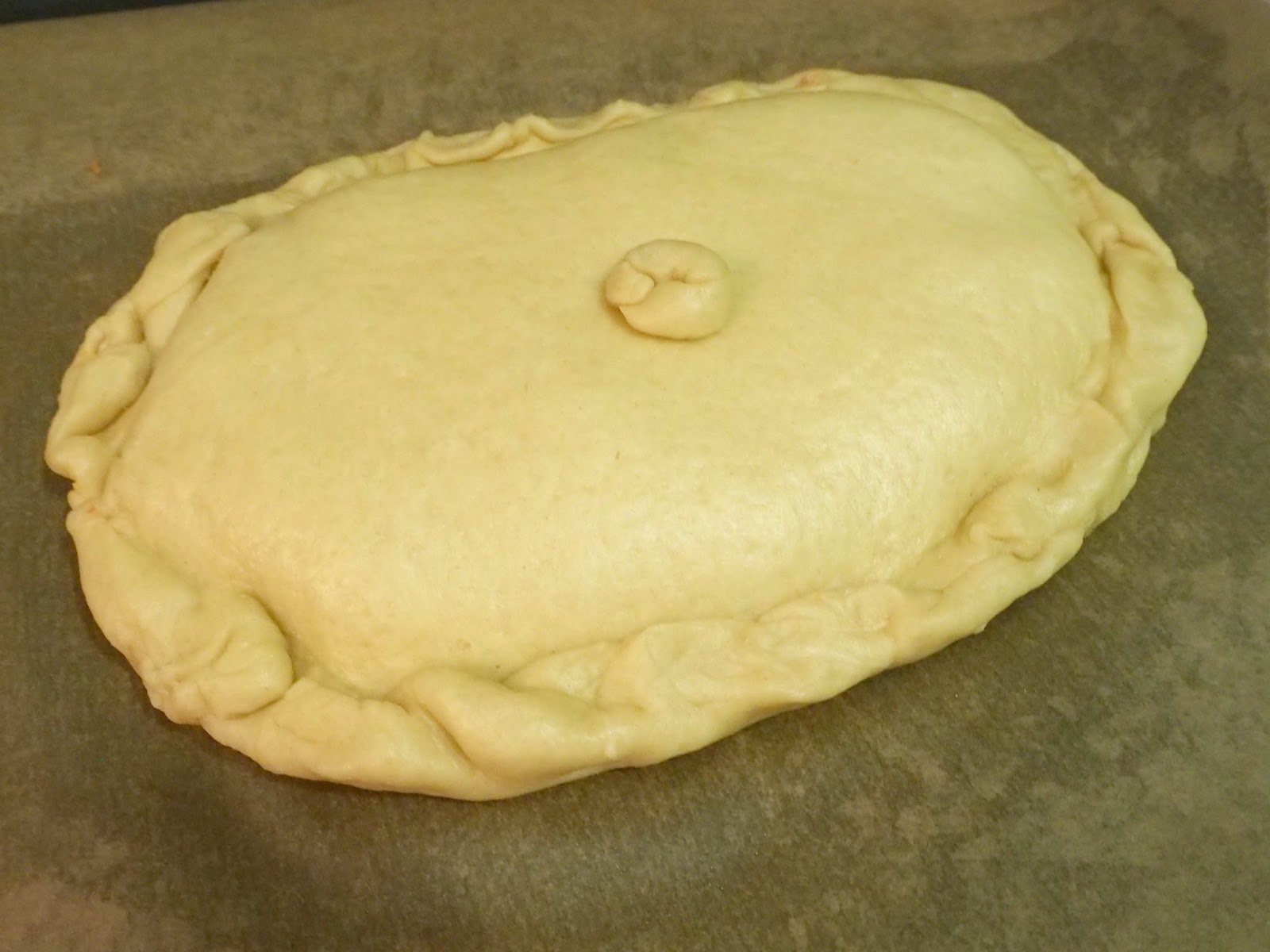 - Por último colocamos el otro trozo de masa encima del relleno, cerramos haciendo pliegues y pintamos con huevo la superficie par aque quede dorada. Horneamos en el horno ya caliente a 180ºC 30 minutos.