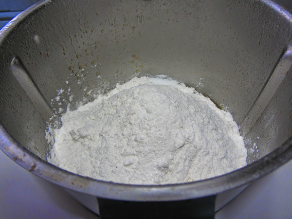Sin Thermomix: ponemos en un bol grande el aceite, el vino y la sal. Calentamos un poco el agua, y disolvemos en ella la levadura; la agregamos al bol. Después añadimos la harina, amasamos con las manos hasta formar una bola.