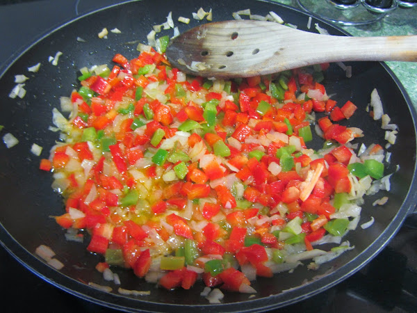 Picamos en cuadritos pequeños la cebolla y los pimientos, y los rehogamos en el aceite caliente, a fuego medio .