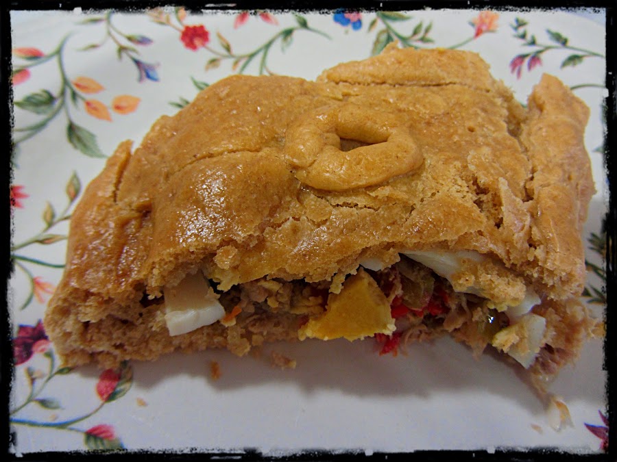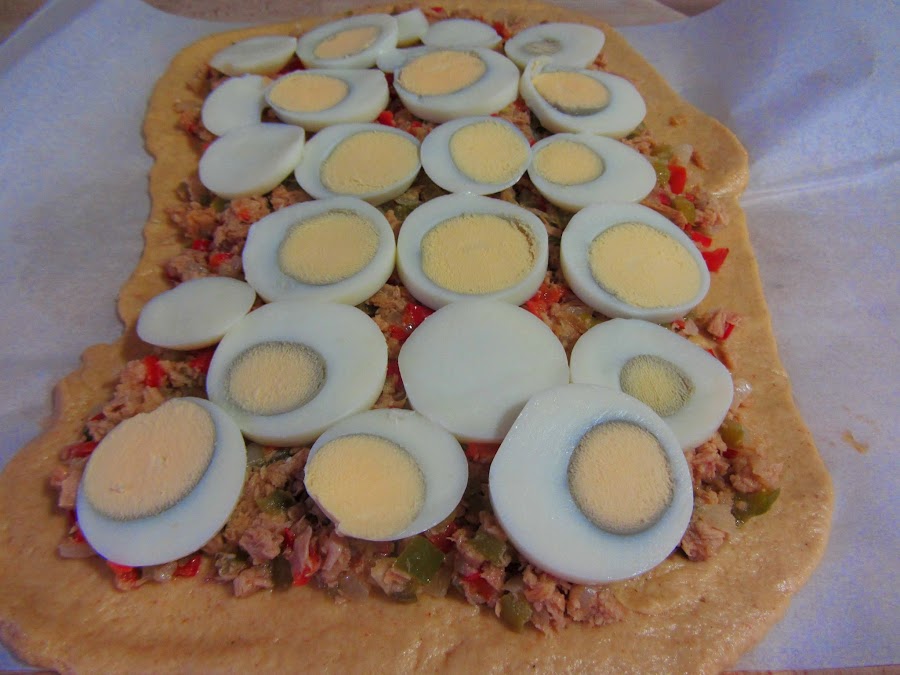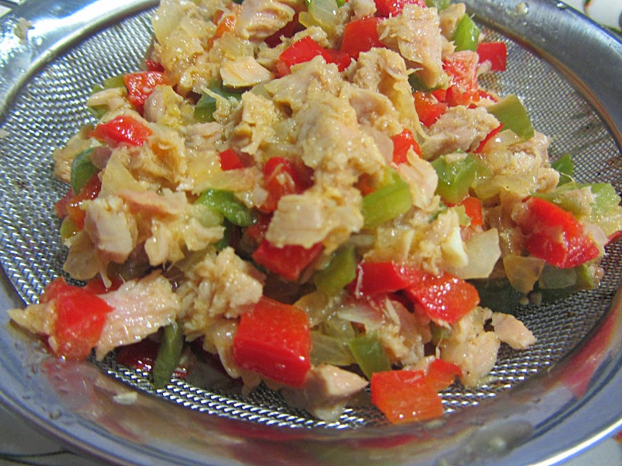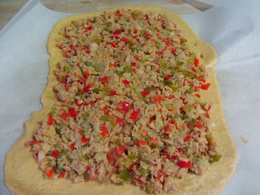 Admite muchísimos rellenos diferentes. Pero esta vez he querido prepararla con el relleno más tradicional, "de toda la vida": atún, cebolla y pimientos.