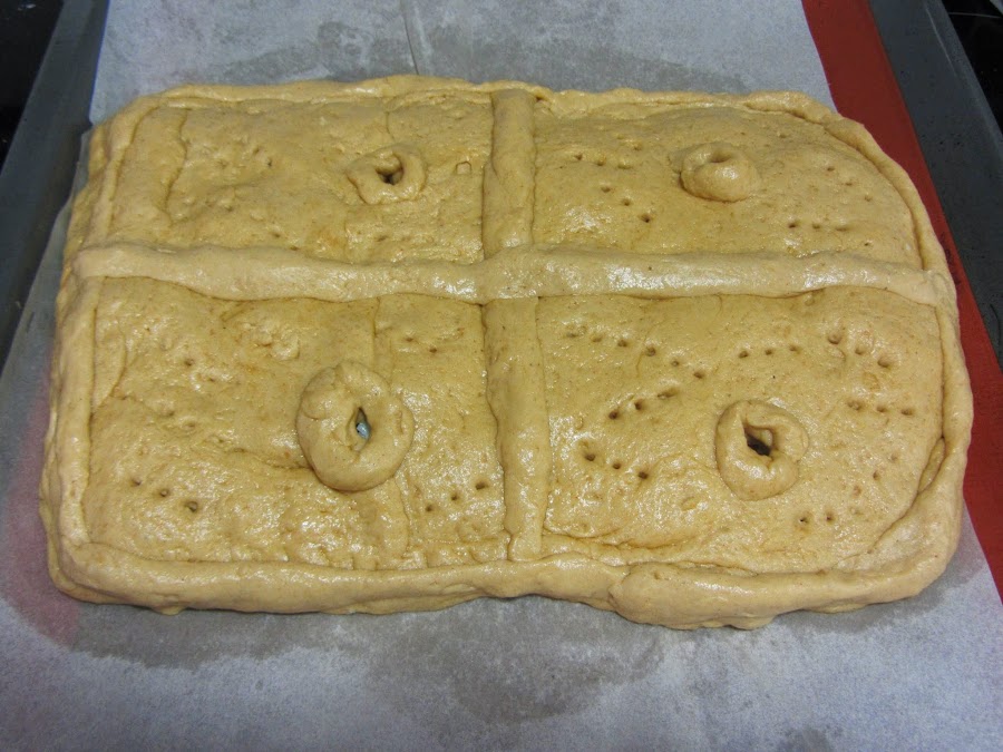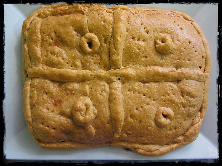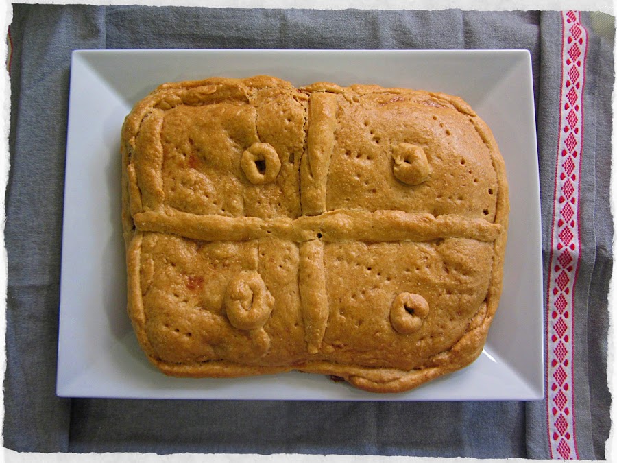 Tapamos con la otra parte de la masa (dejaremos siempre un poquito para hacer algún adorno en la empanada), sellamos bien las uniones con los dedos (y con un poquito de agua, si fuera necesario), pinchamos la superficie de la empanada para que salga el vapor (yo, como veis, también le hago algún que otro boquete más grande), y adornamos con la masa sobrante.