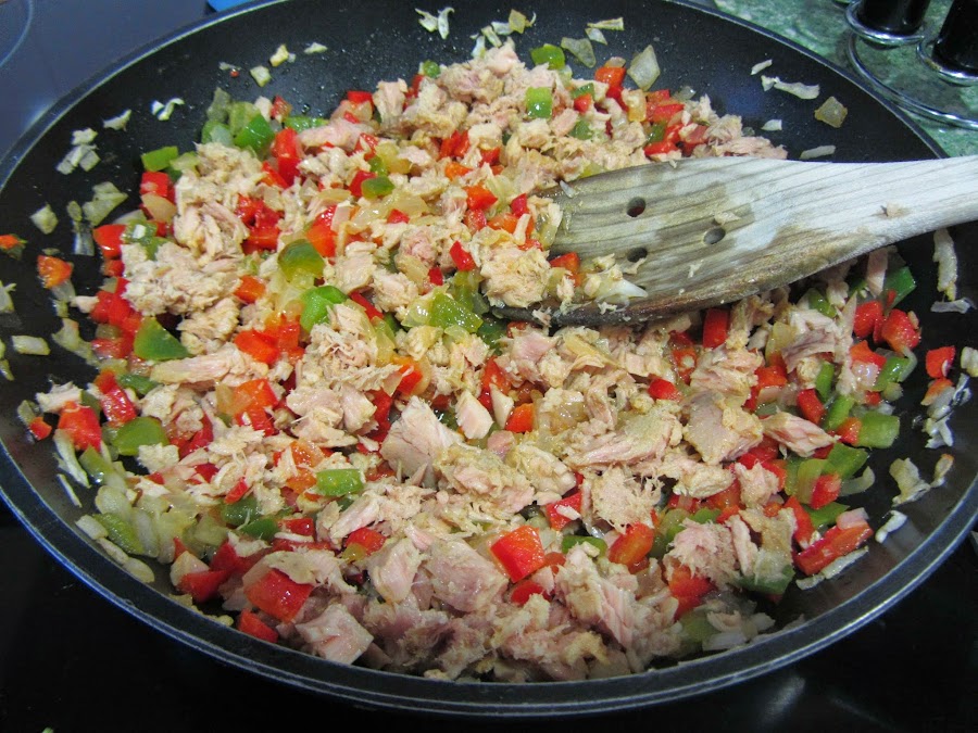 Cuando las verduras estén pochadas (blanditas), añadimos el atún desmigado, mezclamos, y rehogamos un poquito, 1-2 minutos, no más.