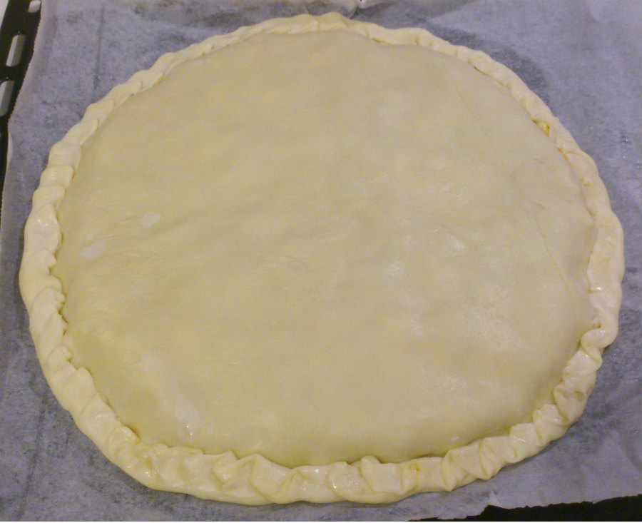 14. Coloca la otra plancha con cuidado por encima y ve "pellizcando y doblando" los bordes para cerrarla. Yo suelo mojar un poco con agua los bordes antes de doblarlos para que peguen.