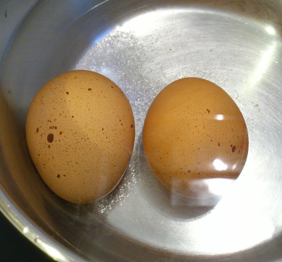 1. En un cazo con agua hirviendo con un poco de sal pon a cocer 2 huevos durante 12 ó 16 min (dependiendo el tamaño del huevo).. Pasado este tiempo pásalos a un cuenco con agua fría para parar la cocción y evitar que la cáscara se pegue al pelarla.