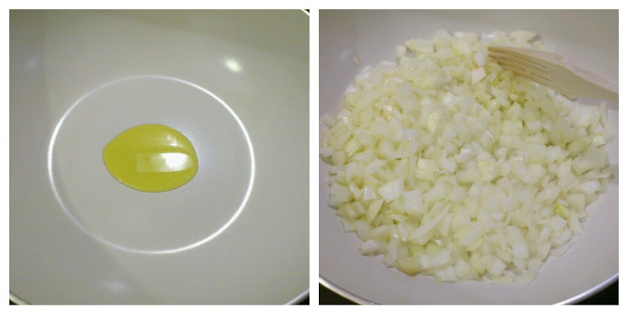 2. Pica las cebollas en trocitos no muy grandes.. Cuando esté lista, pon una sartén alta o perol a calentar con un chorrito de aceite de oliva (ya véis que no es necesario poner mucho) y cuando éste esté caliente echa la cebolla, un poco de sal y rehógala. Remueve de vez en cuando (si lo crees necesario puedes añadir una pizquina de agua para que no se seque).