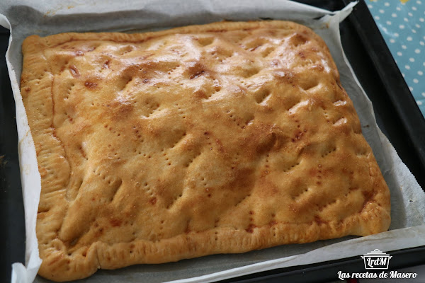 Cortamos la masa en dos, estiramos una mitad con un rodillo en la encimera previamente enharinada haciendo forma de un rectángulo con las mismas dimensiones que la bandeja del horno. Pinchamos con un tenedor la superficie, repartimos el relleno uniformemente y cubrimos con la otra mitad de masa bien estirada. Cortamos el sobrante con un cuchillo bien afilado. Enrollamos los bordes con los dedos o apastamos con un tenedor.