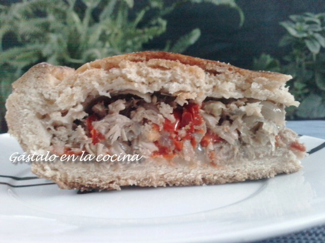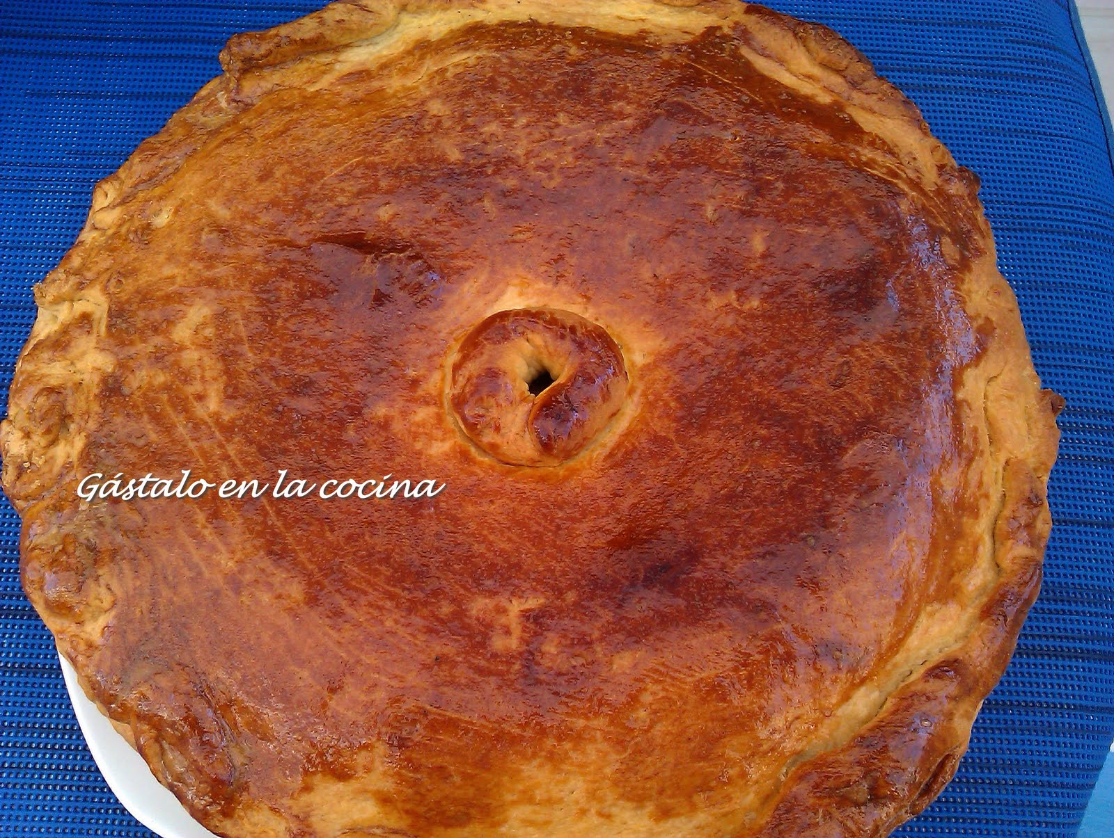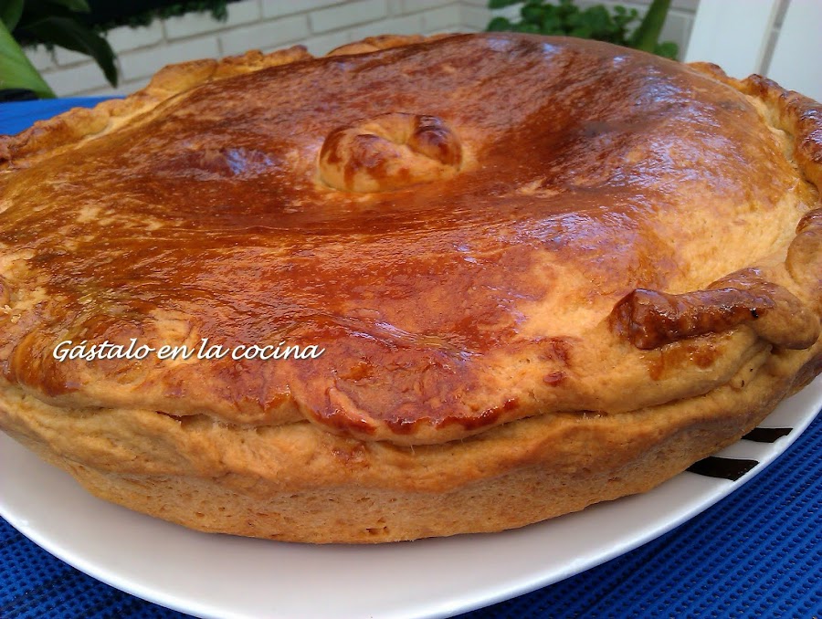 Cortamos la masa por la mitad, estiramos una parte y la ponemos en un molde de tarta, echamos el relleno y tapamos con la otra mitad de la masa, hacemos un agujerito en el centro de un dedo de grosor para que salga el vapor, pintamos con una yema de huevo y metemos en el horno a 180º calor arriba y abajo durante 30-40 minutos.