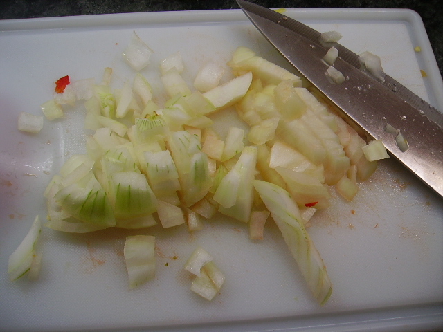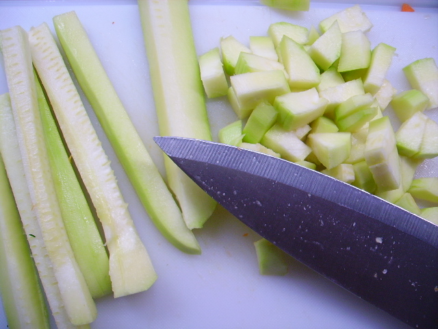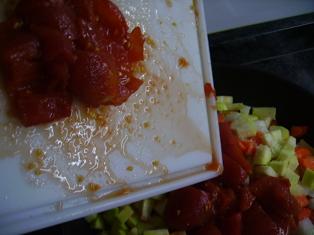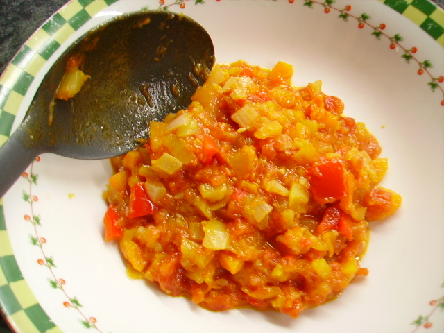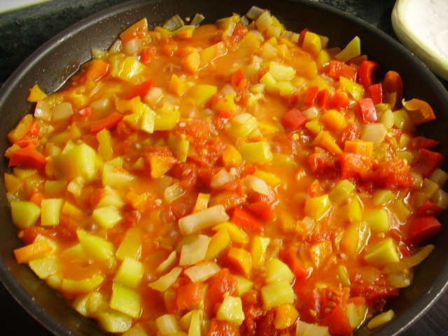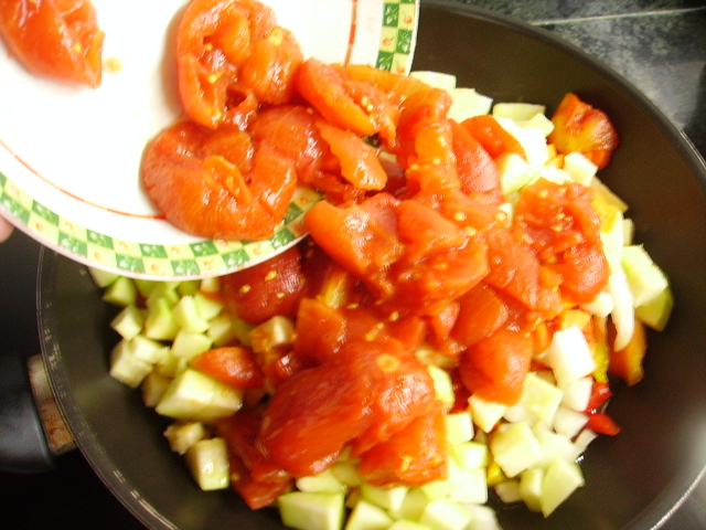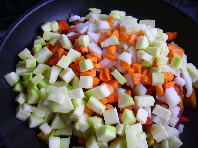 1.- Picamos toda la verdura y los tomates pelados y hacemos un sofrito con un poco de aceite y sal.
