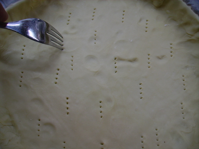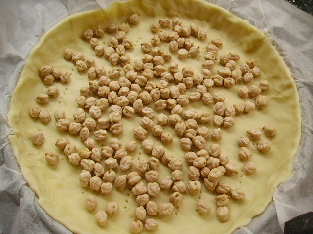 3.- Mientras en un molde colocamos la base de la empanada, pinchamos con el tenedor y ponemos unos garbanzos para que no suba.