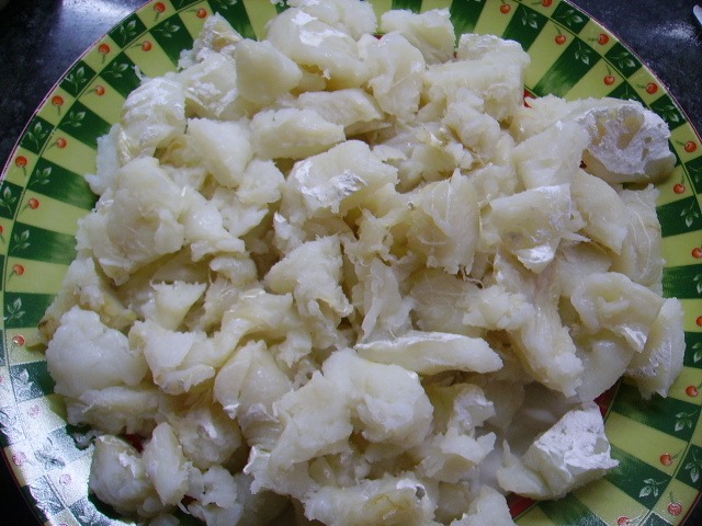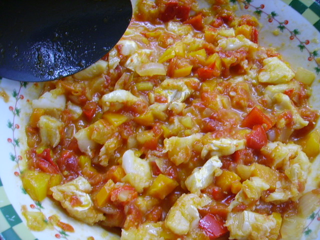 4.- Troceamos las migas de bacalao y mezclamos con el sofrito la cantidad que necesitemos para el relleno de la empanada.