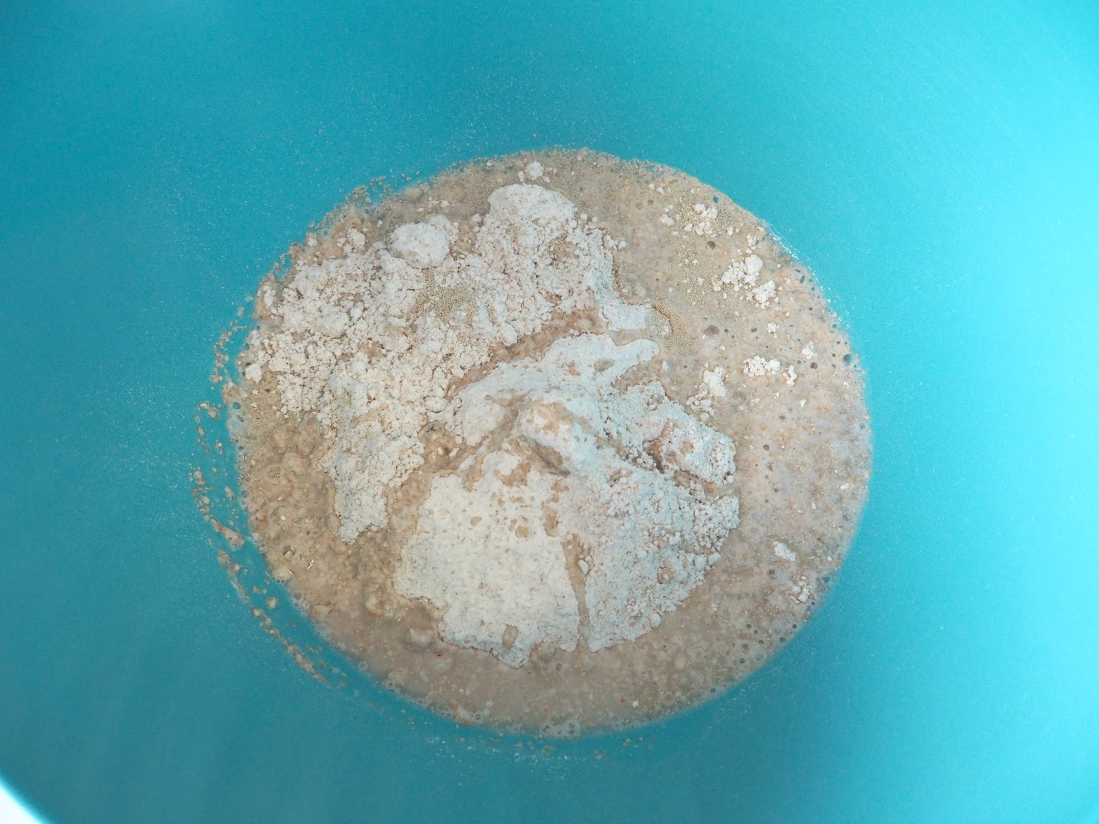 - En un bol mezclamos la harina y la levadura y añadimos el agua. Seguidamente incorporamos el aceite y la sal.