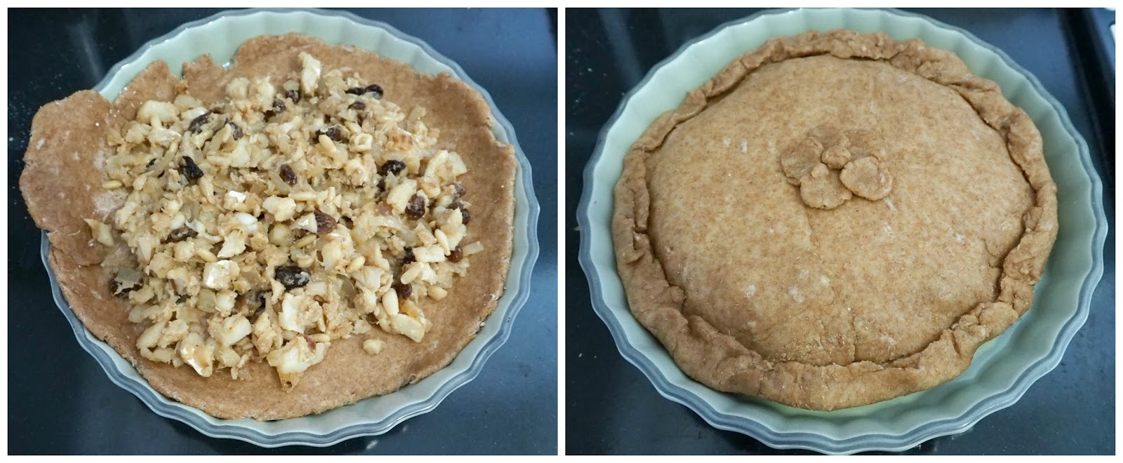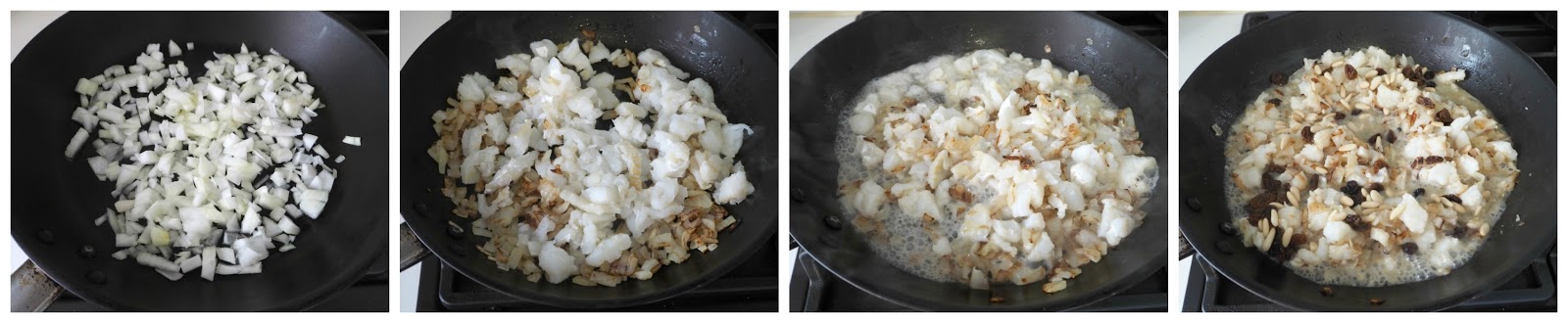 - Mientras reposa la masa preparamos el relleno. Para ello, ponemos a dorar la cebolla picada en una sartén con un poco de aceite. A continuación añadimos el bacalao (recordad que ya está en su punto de sal). Mezclamos y dejamos hacer un par de minutos. Seguidamente echamos un chorrito de vino blanco y dejamos que cueza. Por último añadimos las pasas y piñones y removemos. Dejamos cocinar hasta que veamos que está todo hecho y el vino evaporado. Quitamos del fuego y dejamos enfriar.