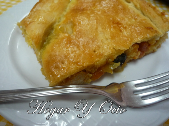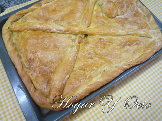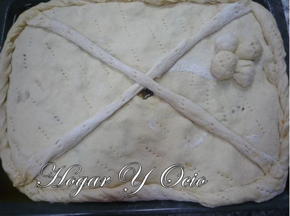 7. Estiramos la otra mitad de la masa y cubrimos la empanada. Con un cuchillo recortamos los bordes que sobresalgan de la bandeja, y a continuación , cerramos la empanada formando el típico corrosco.
