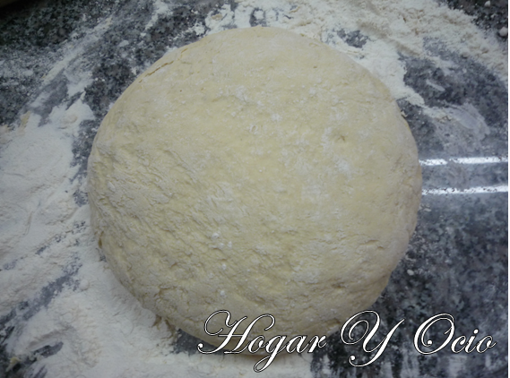4. Una vez que la masa haya crecido la dividimos en dos partes. Espolvoreamos harina en nuestra superficie de trabajo y con un rodillo estiramos la primera mitad.