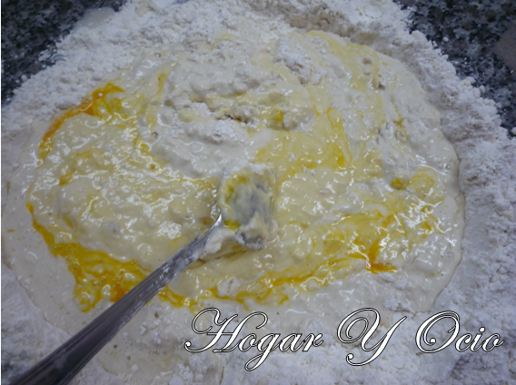 1. En primer lugar vamos a preparar la masa. Sobre nuestra superficie de trabajo perfectamente limpia, formamos un volcán con la harina. En el centro ponemos la levadura ligeramente desecha, la manteca en trocitos y la sal (cantidad al gusto). A continuación, agregamos poco a poco el agua templada, a la vez que vamos mezclando los ingredientes con la ayuda de una cuchara. Cuando la levadura y la manteca ya estén bastante disueltas agregamos el huevo y seguimos mezclando. La masa se irá volviendo más espesa y tendremos que comenzar a trabajarla con las manos. Amasaremos durante un rato añadiendo más harina si fuese necesario.