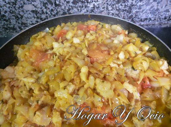 3. Mientras tanto, vamos a hacer el amoado. Ponemos al fuego una sartén con abundante aceite. Picamos la cebolla y el ajo finos y los añadimos. Dejamos pochar y cuando la cebolla esté transparente agregamos los tomates (pelados y cortados en dados pequeños), el perejil cortado finito y el bacalao desmigado. Terminamos de pochar todo y retiramos del fuego.