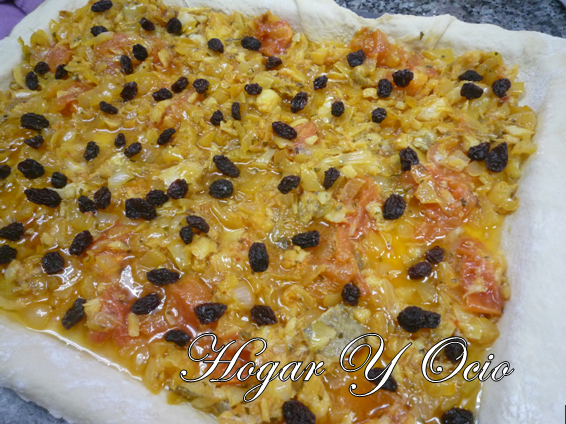 6. Ponemos el relleno sobre la masa y le agregamos las pasas por encima.