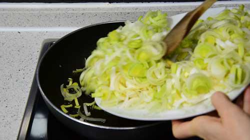 A continuación, en una sartén agregamos un chorreón de aceite de oliva y cuando esté caliente añadimos el puerro y la cebolla troceados.