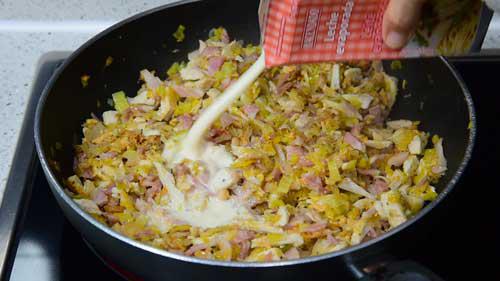 Luego echamos la leche evaporada o nata (crema de leche) hasta cubrir bien los ingredientes. Rectifica de sal y pimienta si es necesario. Y deja que la salsa cueza a fuego medio durante unos minutos hasta que reduzca y el sofrito quede casi seco.