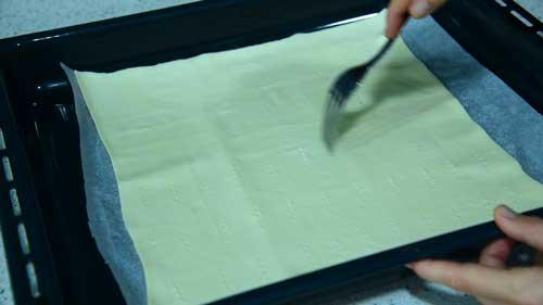 Pinchamos con un tenedor la masa de arriba y precalentamos el horno a 180 grados.