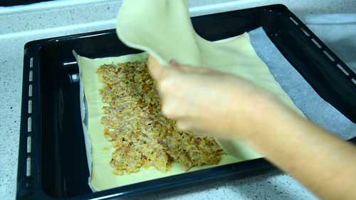 Estiramos la otra masa de empanada y cubrimos el relleno con esta masa intentando que coincidan todos los extremos.