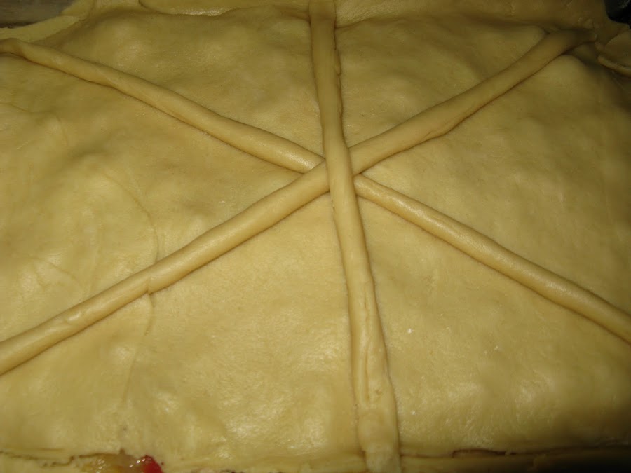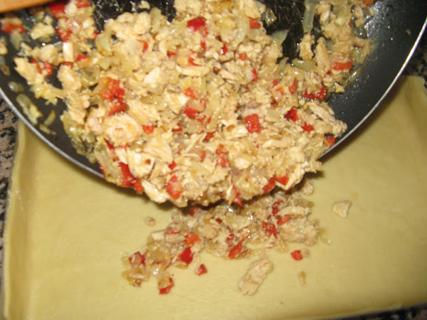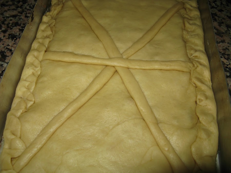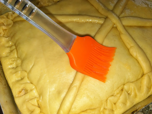 Después con la otra parte de la masa hacemos la parte superior, ponemos sobre el relleno y antes de cerrar adornamos