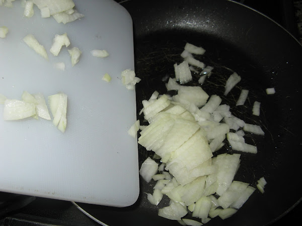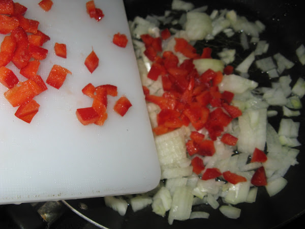 Echamos aceite en una sartén y añadimos la cebolla y el pimiento bien picado todo
