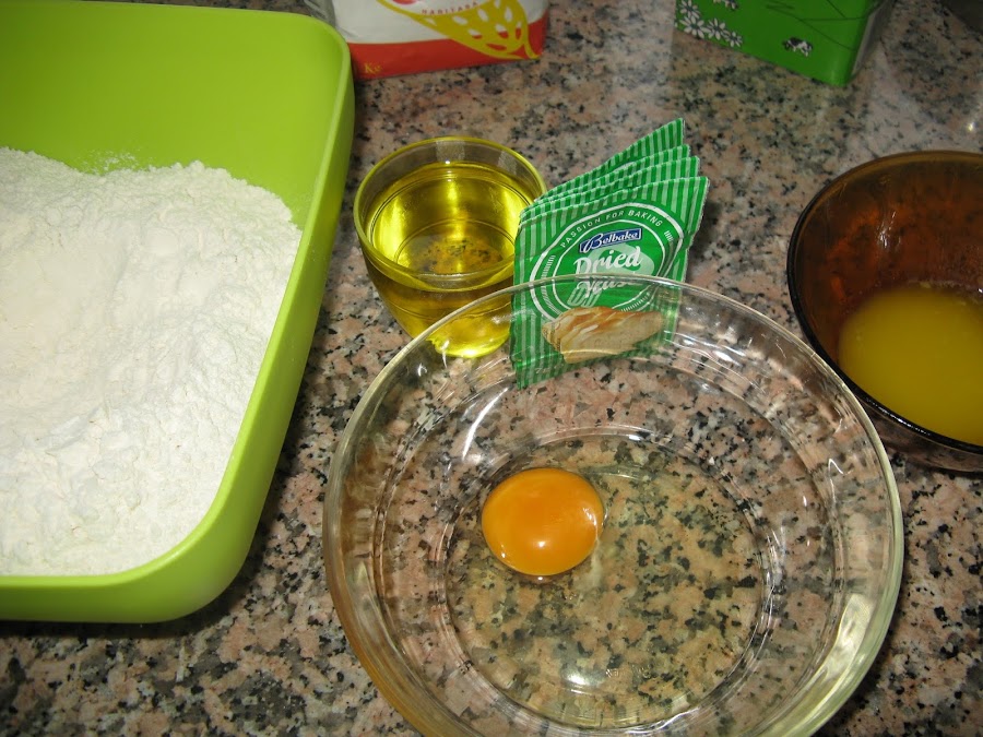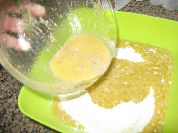 En una fuente batimos el huevo, la mantequilla derretida, el aceite, la levadura, el agua templada y batimos todo bien, por último añadimos el sal