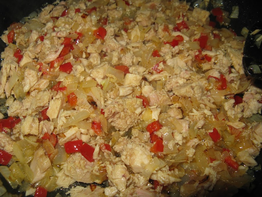 Cuando la cebolla y el pimiento esté bien pochado (no muy frito) añadimos el bonito y dejamos hacerse un poco para que se junten todos los sabores.