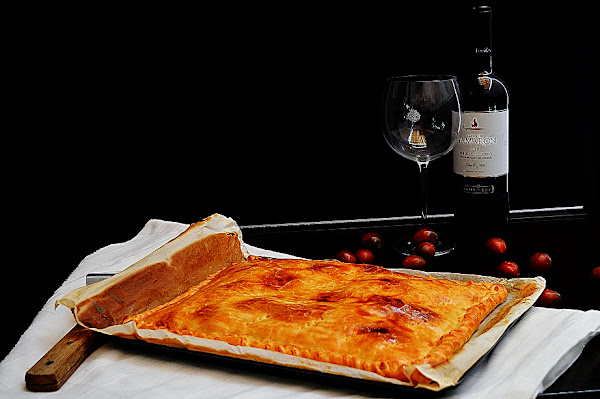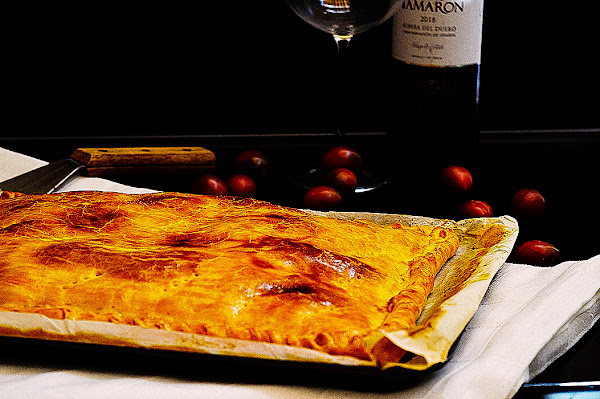 En este caso la empanada va rellena de cebolla, pimiento morrón, tomate frito, huevo duro y caballa en aceite.