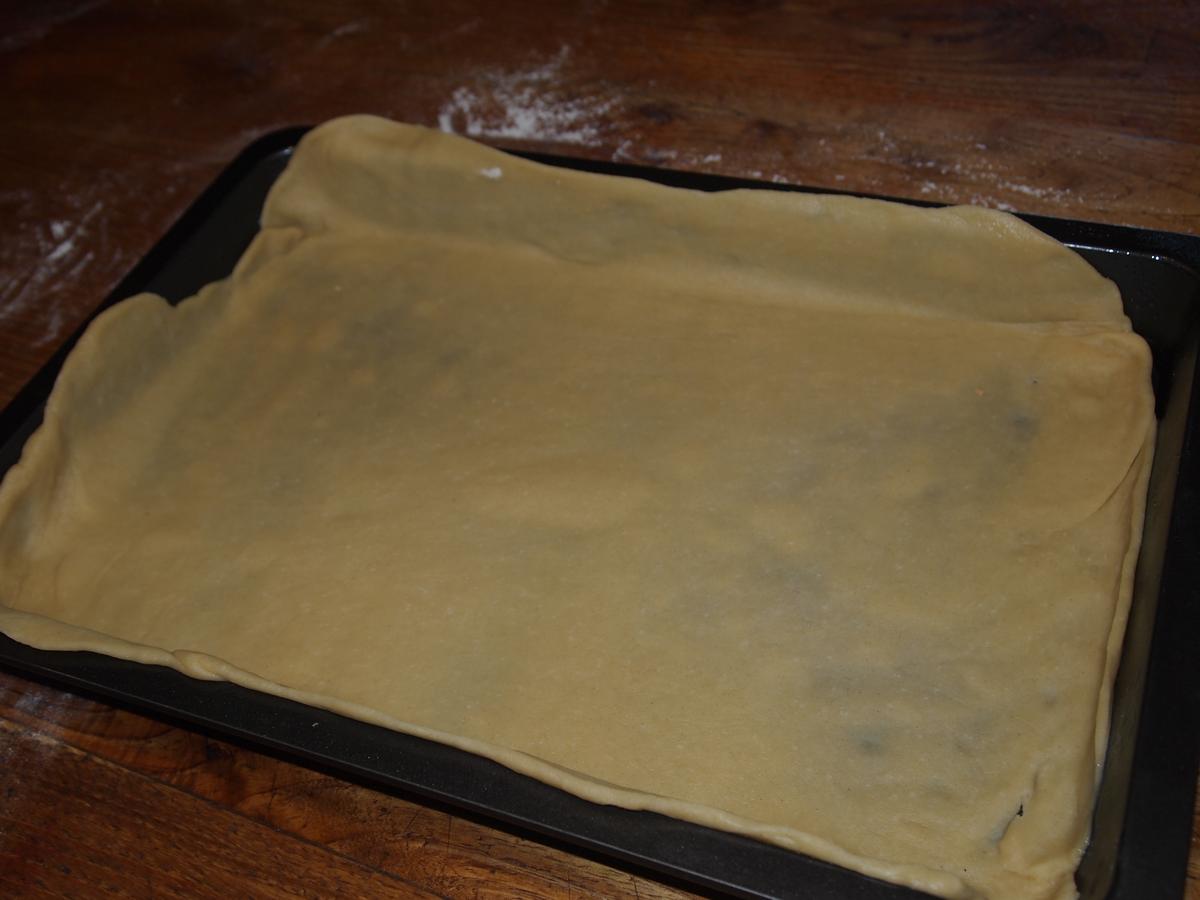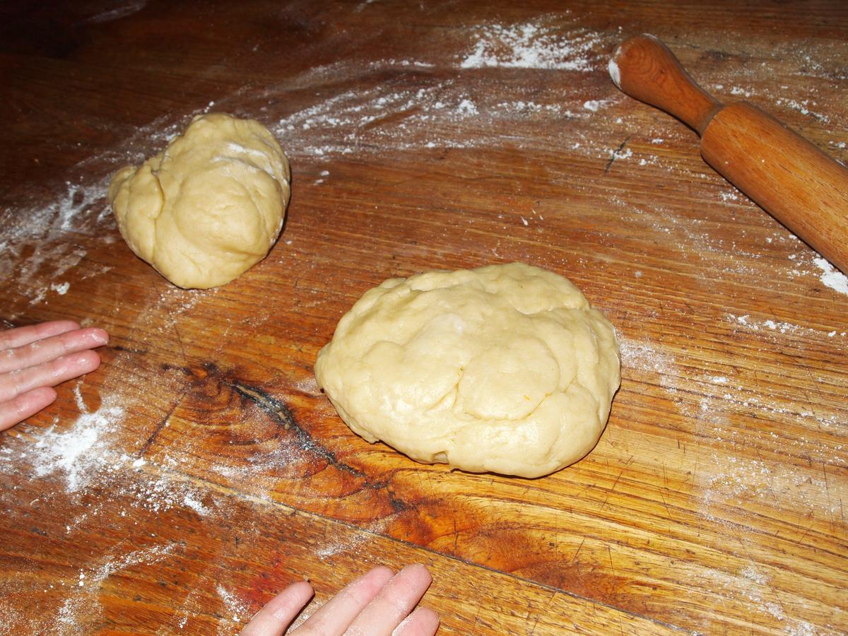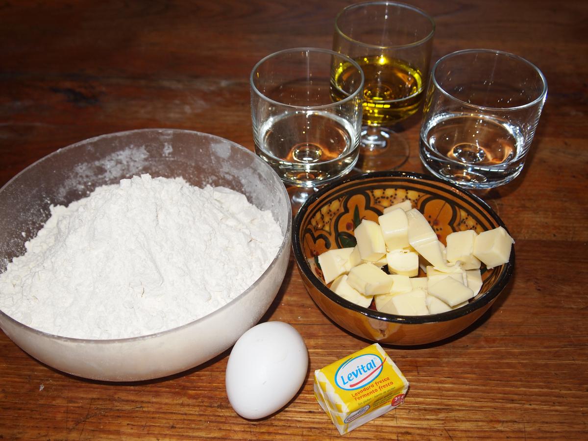 TRADICIONAL: Deshacemos las levadura con el agua templada, importante templada no caliente. En un bol grande poner el aceite, la mantequilla y el vino blanco y calentar 30 segundos en el microondas. Incorporar el huevo, la harina, sal y agua con la levadura y amasar varios minutos hasta obtener una masa elástica, suave y que no se pegue. Se puede usar para ello una amasadora eléctrica con varillas de amasado o procesador de alimentos con opción de amasado.