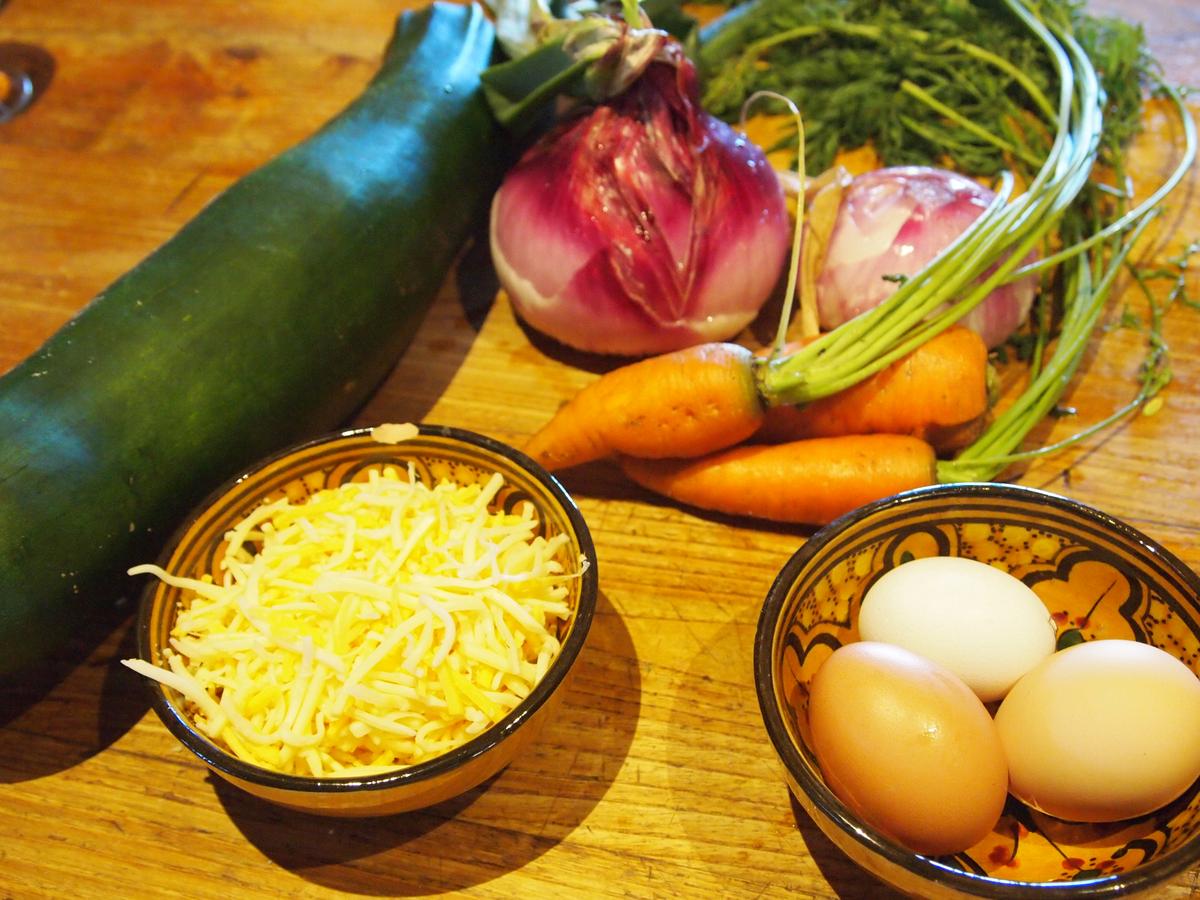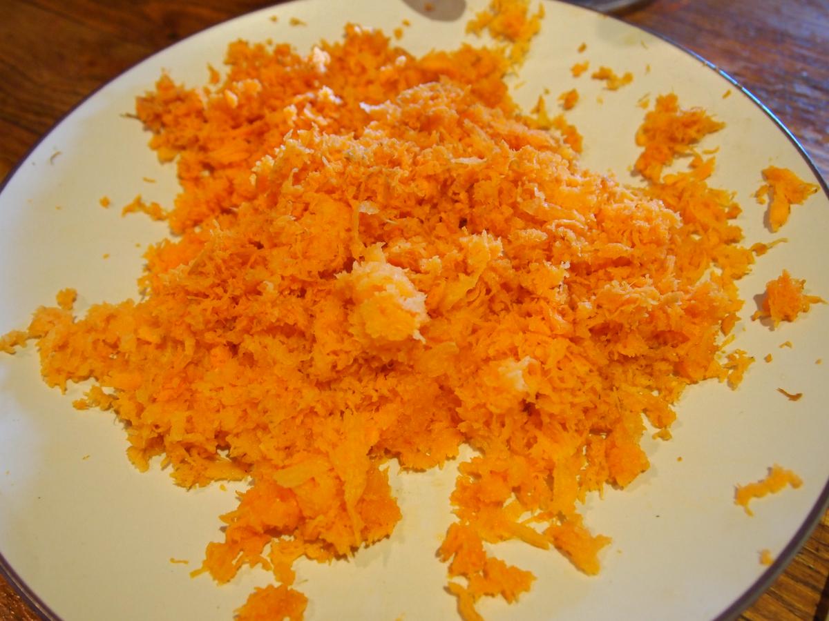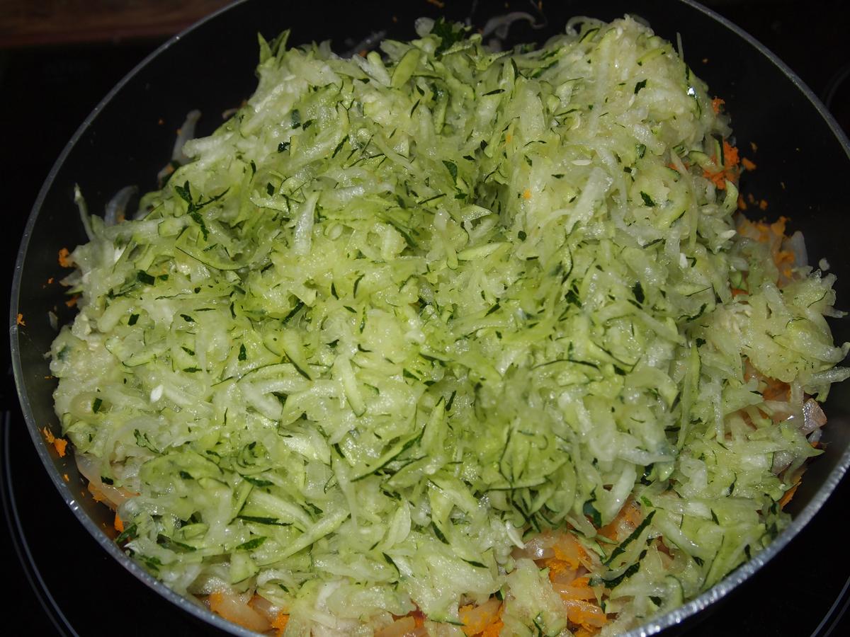 Mientras se pochan las cebollas y la zanahoria, es hora de rallar el calabacín. Se puede hacer a mano con un rallador o con unos golpes de turbo en la thermomix o similar procesador de alimentos que permita picar verduras.