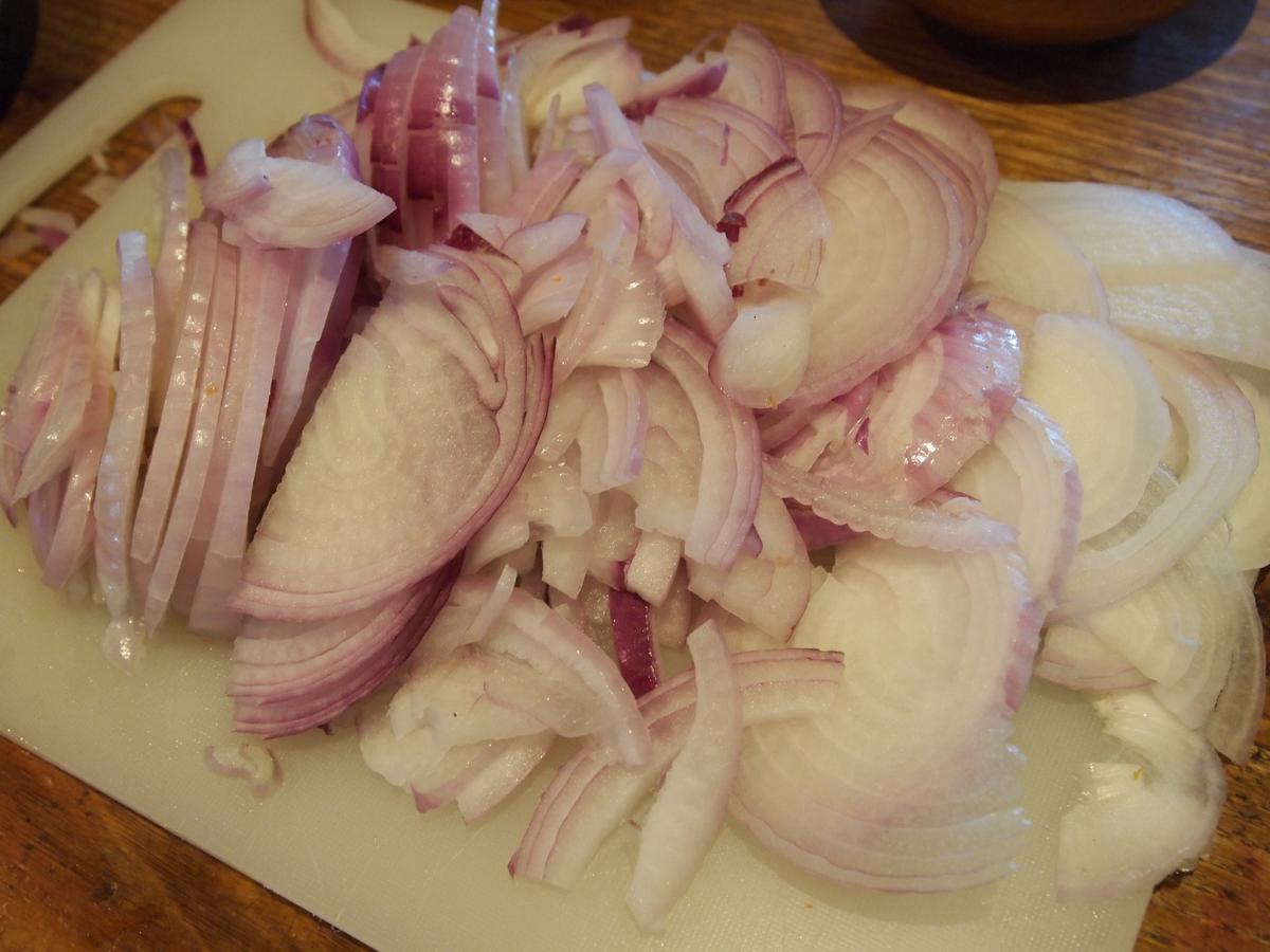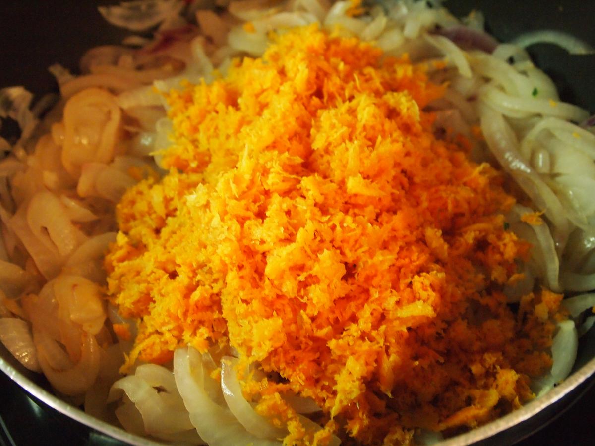 Lo primero es lavar rallar muy fina la zanahoria, cortar en juliana la cebolla y sofreír ambas en una sartén amplia con una cucharada de aceite de oliva.