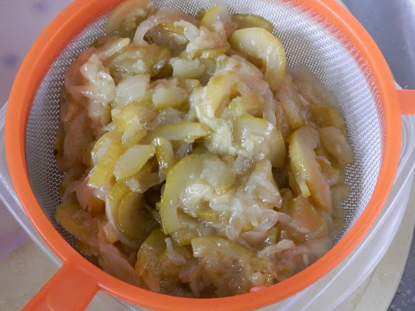 Cuando todo se haya pochado, ponlo a escurrir para que pierda la máxima cantidad de aceite posible y el sofrito quede lo más seco que se pueda.