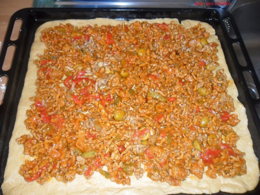 Volcamos en la misma sartén el sofrito escurrido y le agregamos el tomate frito, damos unas vueltas al fuego para que espese bien y rectificamos de sal si hiciera falta, dejamos enfriar mientras preparamos la masa.
