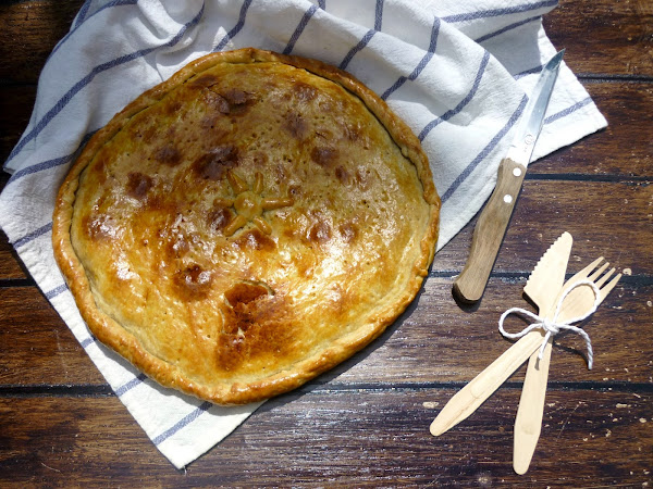 Estiramos mitad de la masa, cubrimos con el relleno y tapamos con el resto de masa, sellamos los bordes y pinchamos con un tenedor. Pincelamos con huevo batido.