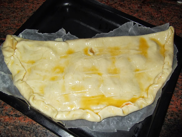 Una vez que ya tenéis todos los ingredientes dentro de la empanada, la cerráis y presionáis bien los bordes. Batís el huevo y la pintáis para que tenga un color más dorado y le hacéis un pequeño agujero en el centro para permitirle la salida de vapor.