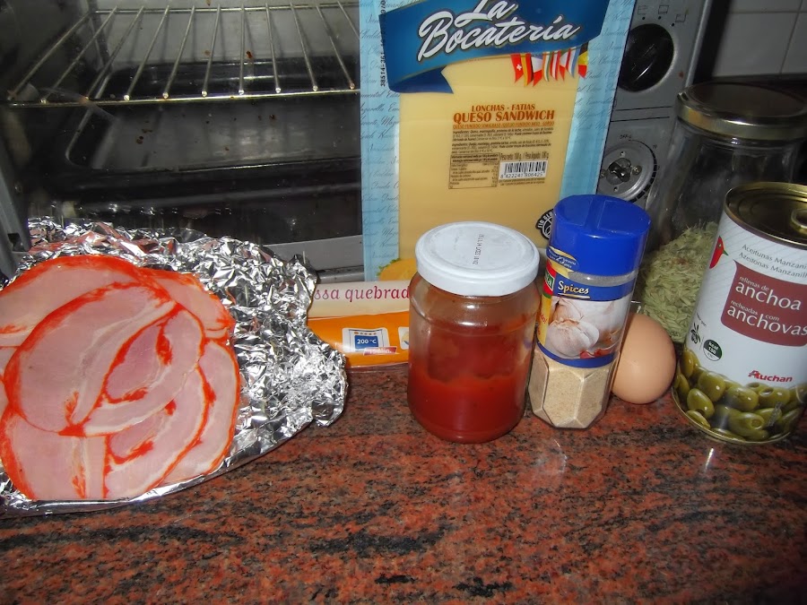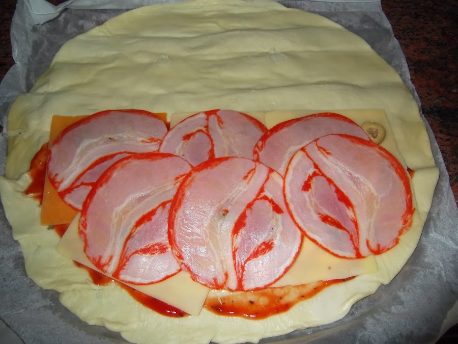 Ponemos una capa de tomate, sin llegar a los bordes, ya que luego habrá que cerrarla. Echamos un poco de orégano y ajo en polvo para darle más sabor y colocamos encima el queso en lonchas, tiene que ser un queso que se funda con facilidad podéis utilizar tranchetes o queso para sandwich. Esparcís algunas aceitunas partidas en trozos y colocáis encima la carne. En este caso he utilizado magreta de cerdo, pero también podéis emplear lomo, lo único que debéis decirle al carnicero que os la corte muy fino; si por el contrario tenéis trozos más gordos os aconsejo que lo paséis un poco por la sartén con aceite, porque si no se os puede quedar un poco cruda.