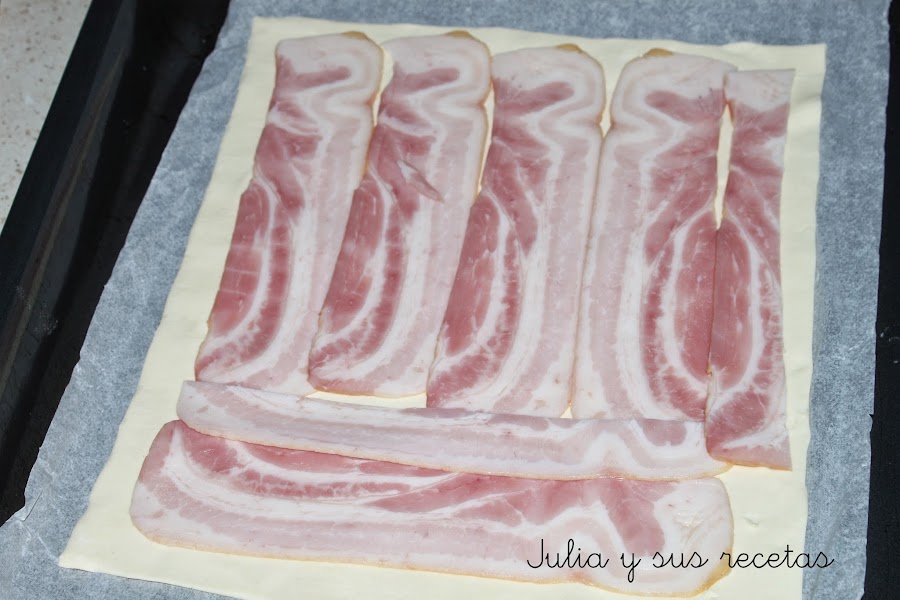 En la bandeja de horno ponemos un papel vegetal . Encima ponemos una plancha de hojaldre ligeramente estirado con el rodillo. Lo cubrimos con el bacon en lonchas.