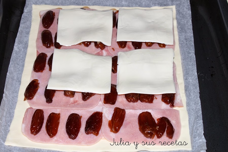 Encima del bacon ponemos lonchas de jamón york, los dátiles sin el hueso y lonchetas de queso encima.