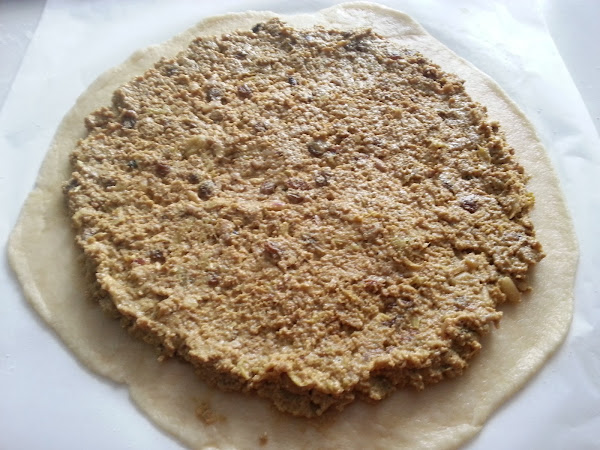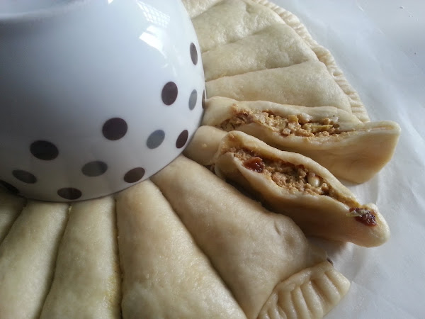 4. - Ponemos nuestro relleno favorito, carne, atún, verduras, chocolate....... dejando los bordes libres para sellar luego con la otra mitad.
