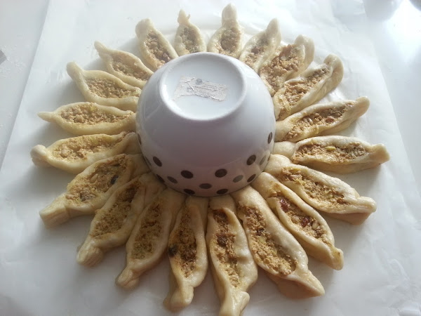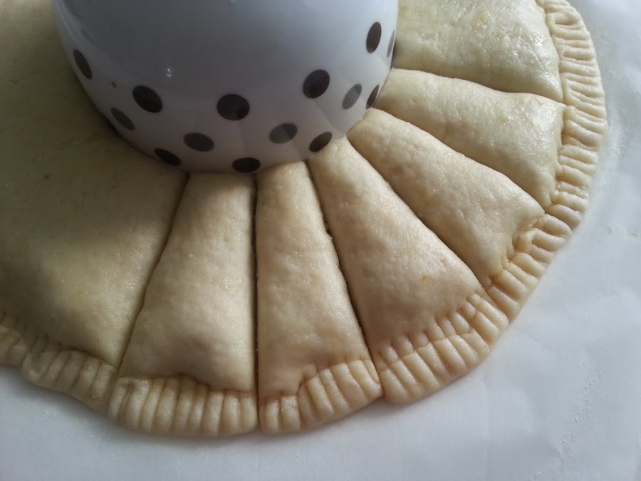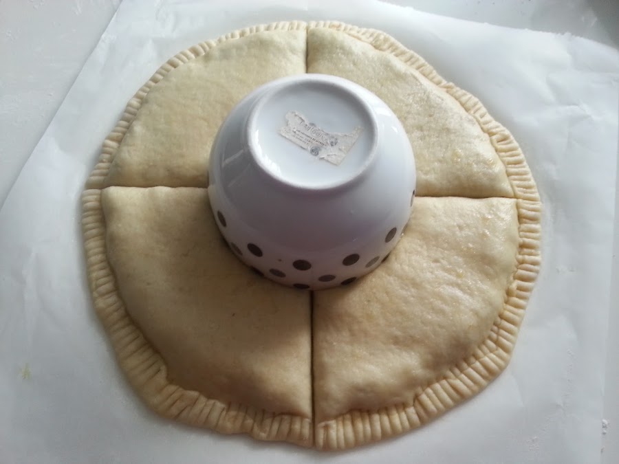 6. - Cogemos una taza o cuenco grande y lo colocamos en el centro de la empanada, haciendo presión, y con una tijera o cuchillo, vamos haciendo cortes alrededor del tazón.