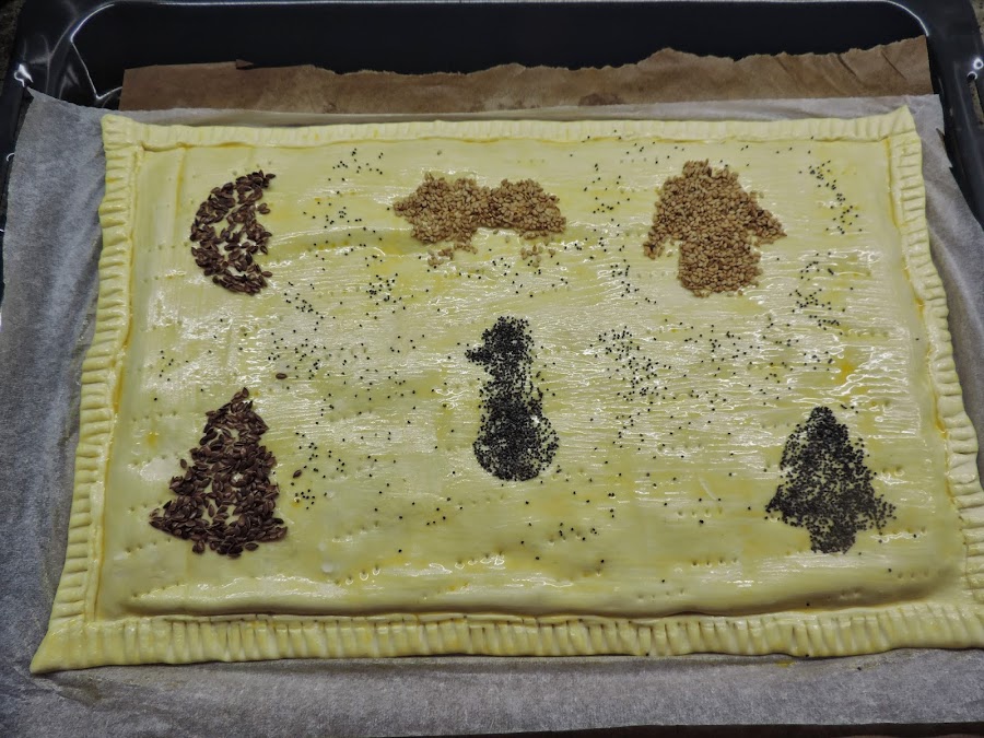 Esta la he decorado con semillas de amapola, orégano y sésamo.